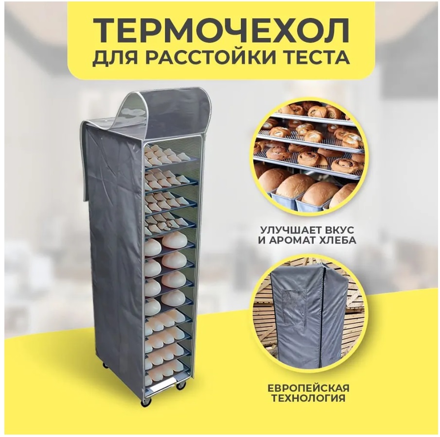 Термочехлы используются перед формованием - это технологический процесс производства хлебобулочной продукции непосредственно перед выпечкой. Пекарский аксессуар является АЛЬТЕРНАТИВОЙ РАССТОЕЧНОГО ШКАФА, поддерживает необходимую температуру. Подходит для холодной ферментации в условиях холодильной камеры, для транспортировки и хранения изделий в охлажденном, замороженном или готовом виде на предприятиях общественного питания и торговли. Исключает излишки влаги при расстойке и заморозке. Не требует электроэнергии и парогенерации. Инерционное тепло, выделяющееся в процессе переработки сахара дрожжевым комплексом в заготовке, отражается от термочехла, создавая идеальную для подъема теста среду.